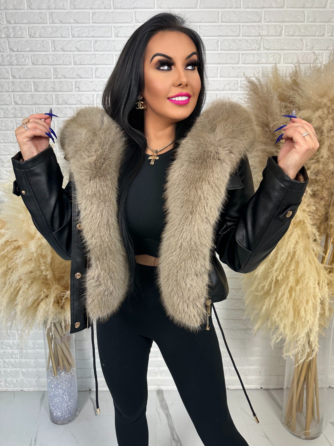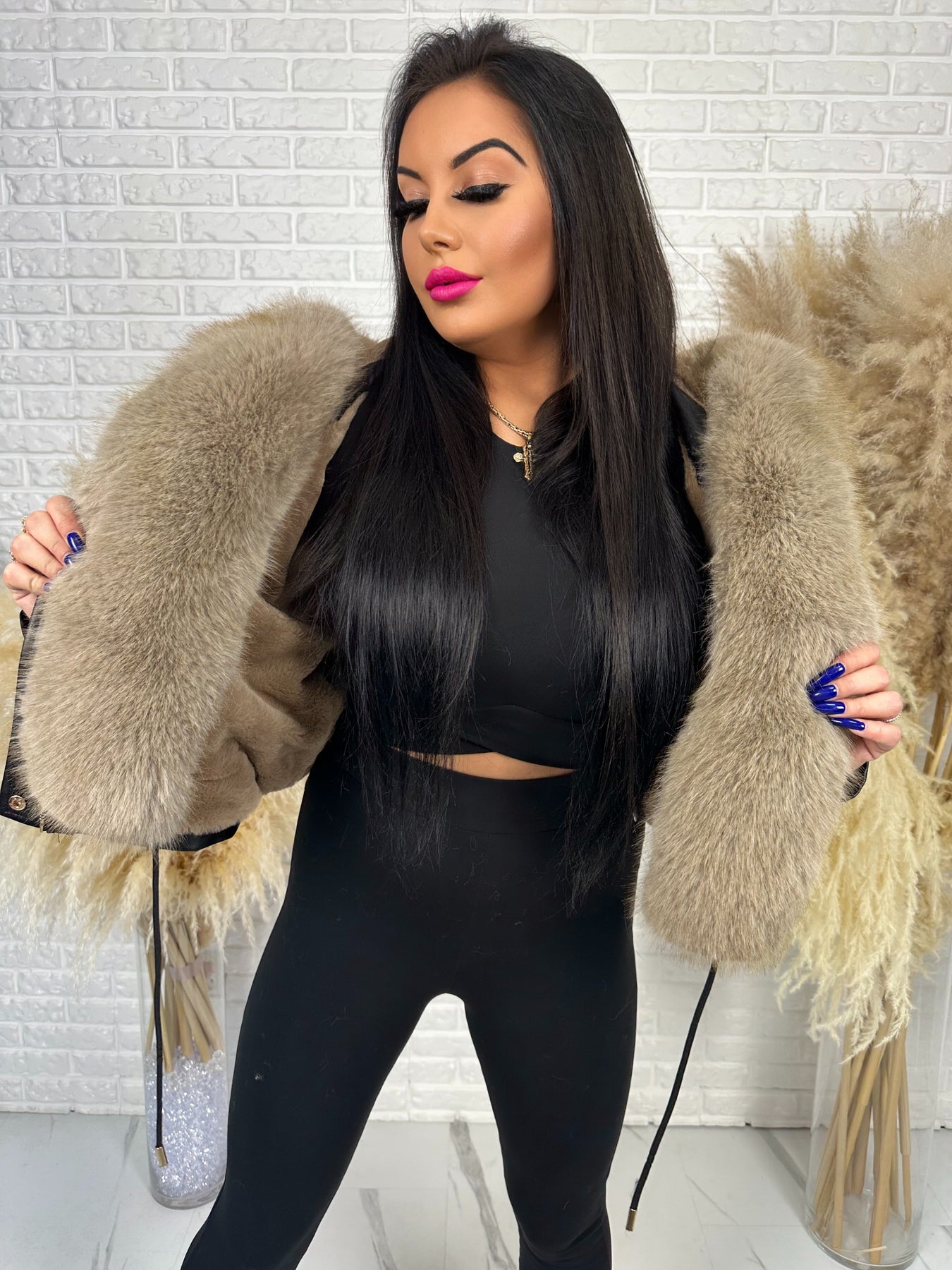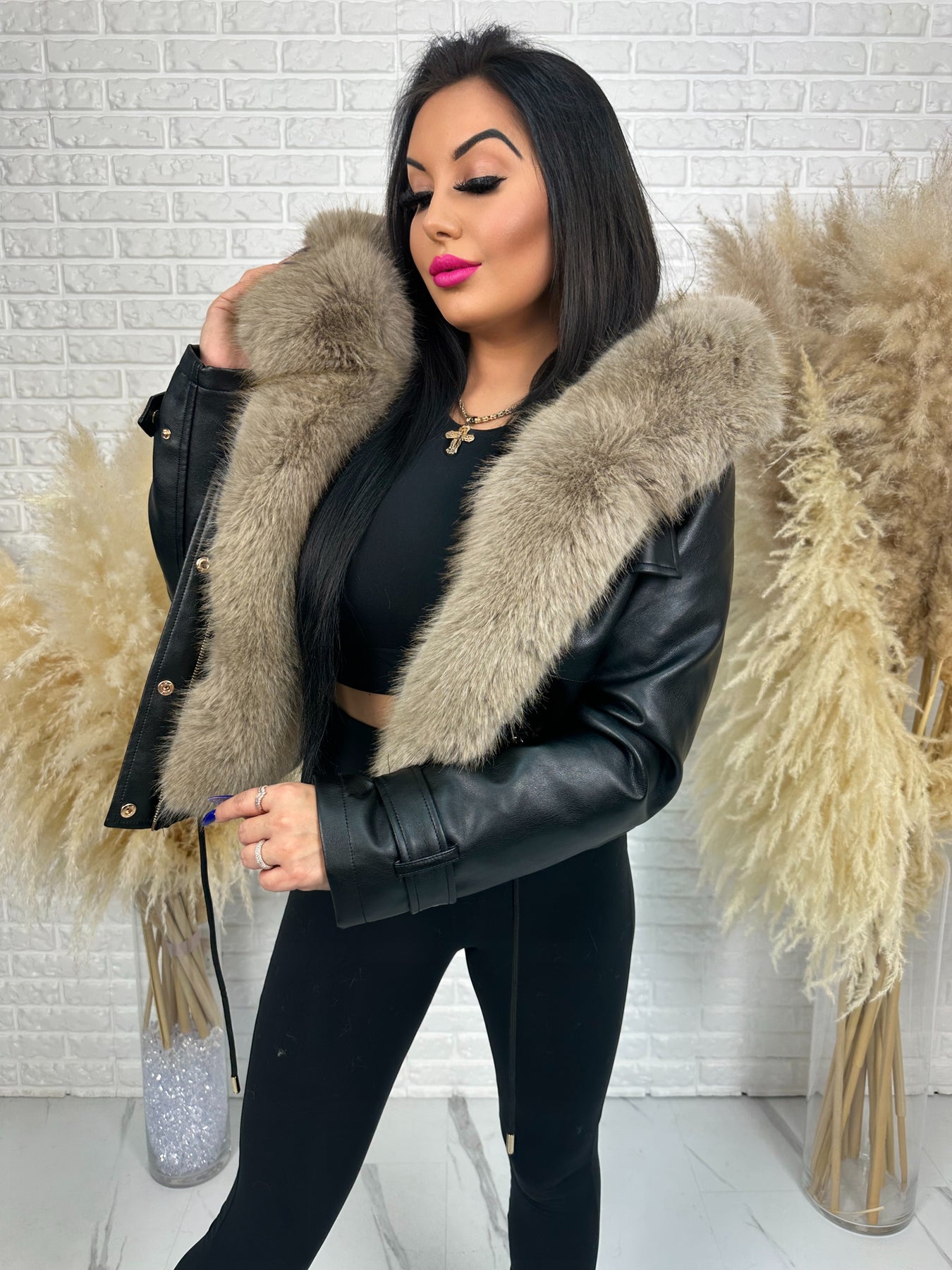 Krótki, lekko oversize’owy fason z ozdobnym futerkiem i złotymi detalami sprawia, że każda stylizacja nabiera wyjątkowego charakteru.