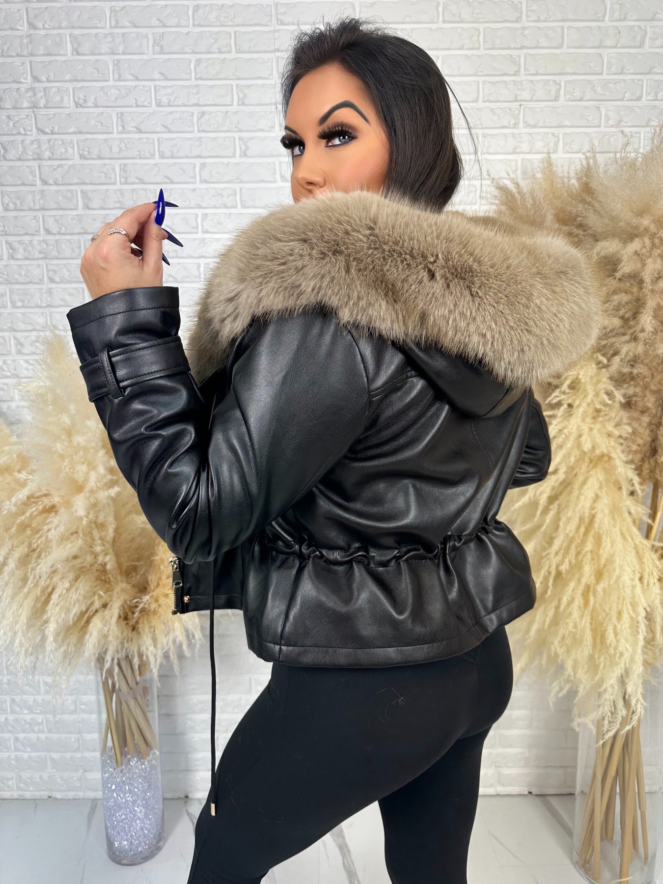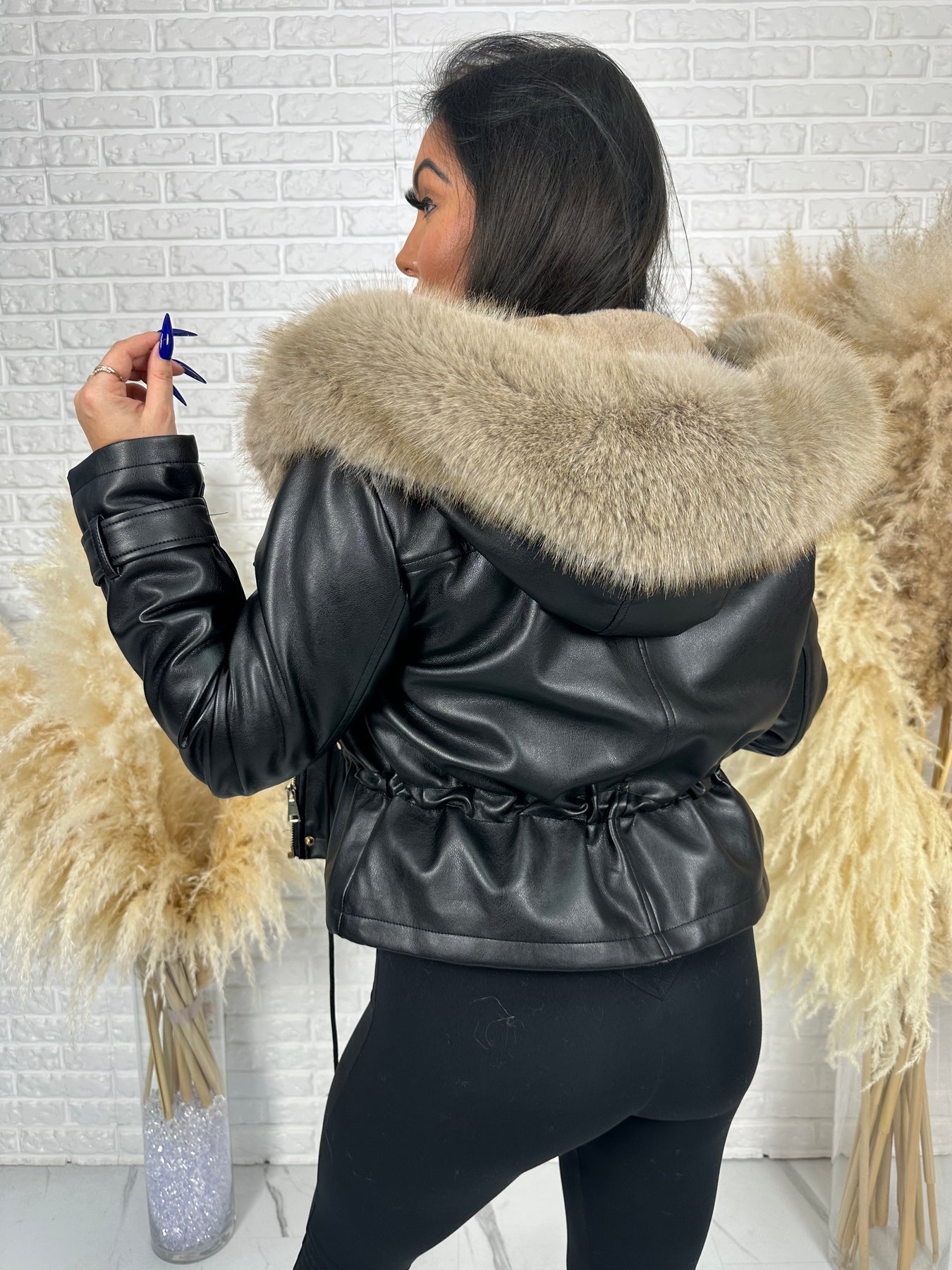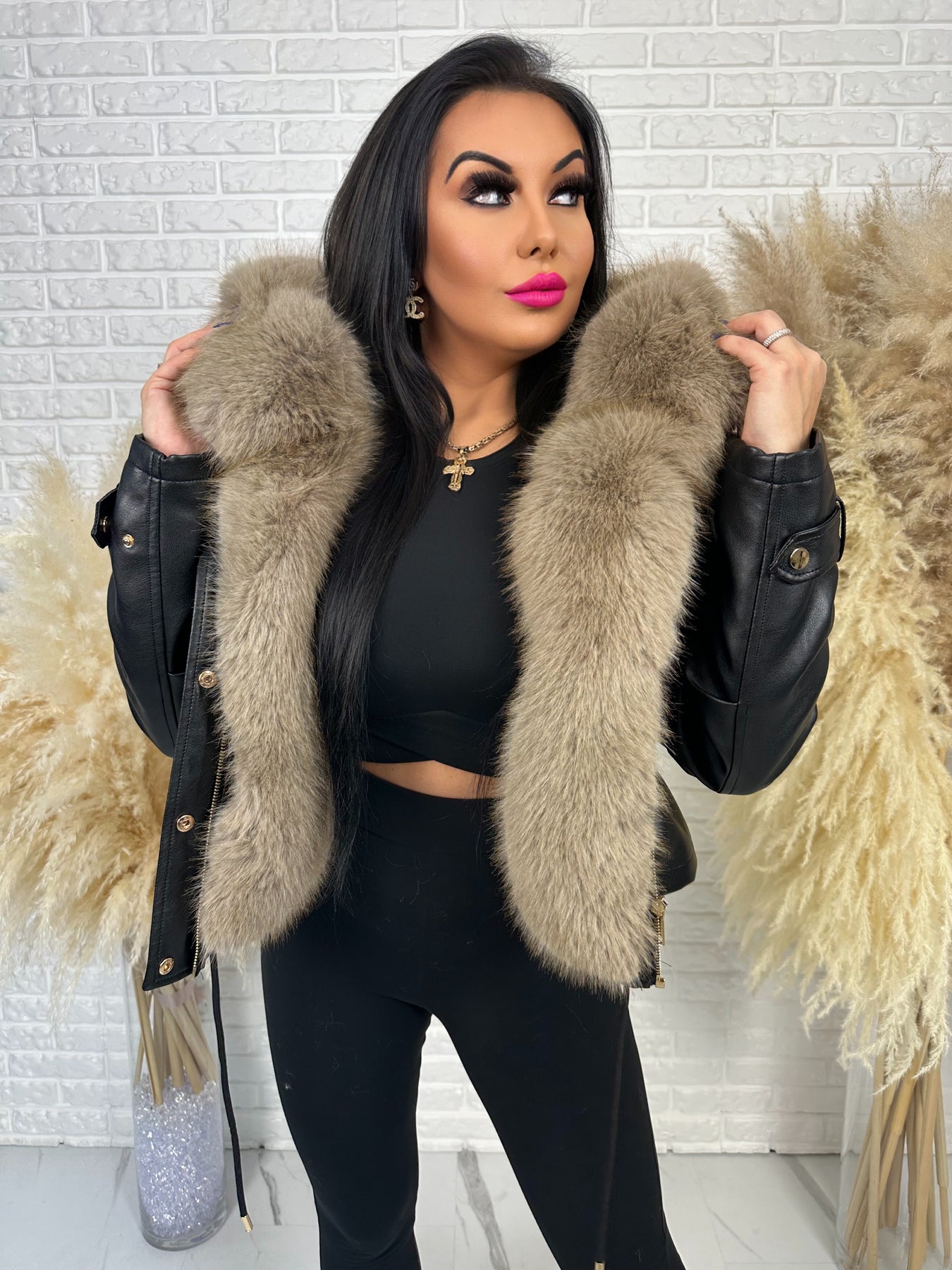 Krótki, lekko oversize’owy fason z ozdobnym futerkiem i złotymi detalami sprawia, że każda stylizacja nabiera wyjątkowego charakteru.