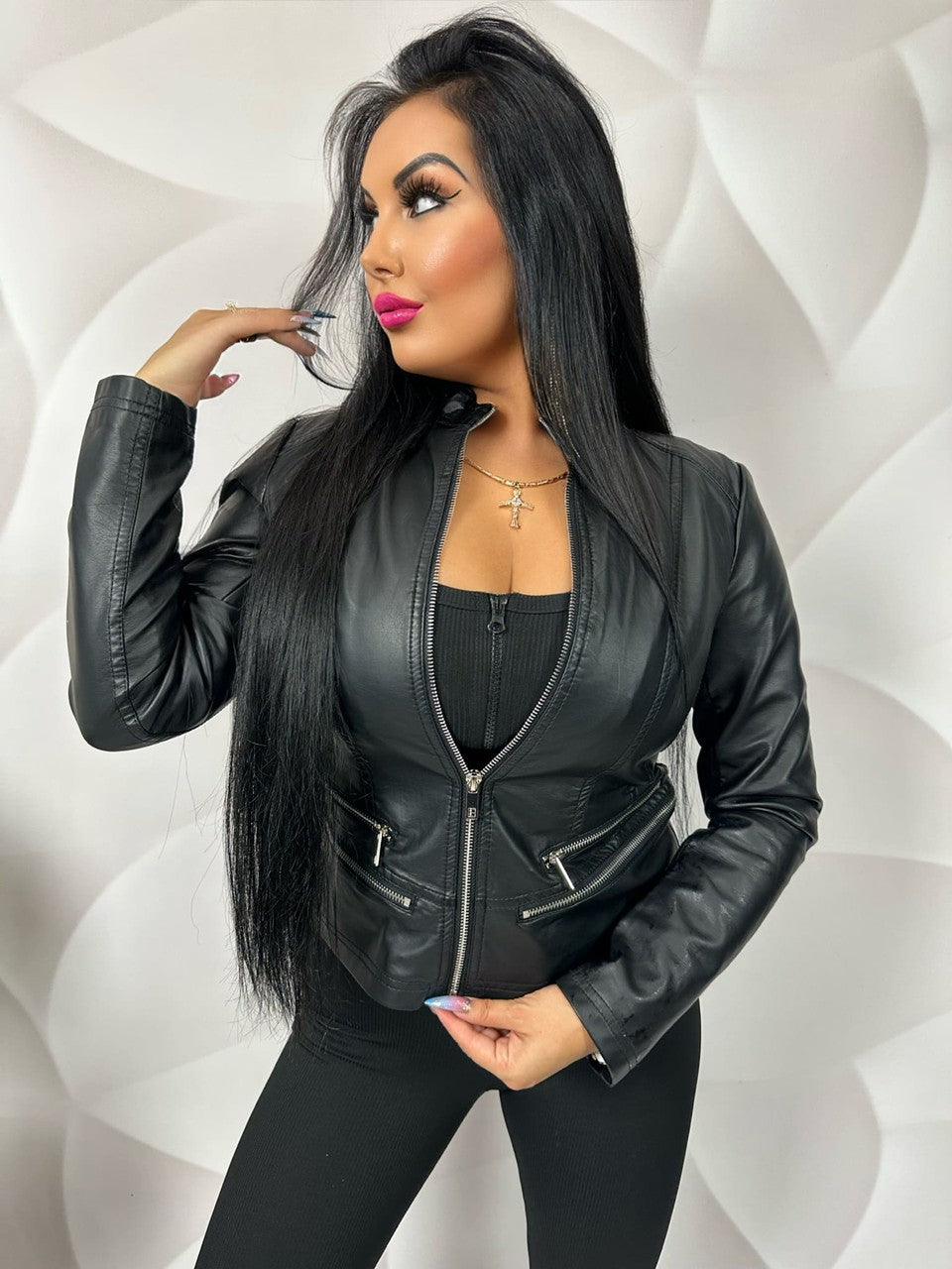Miękka w dotyku, z klasą i odrobiną rockowego charakteru. Ta ramoneska ze stójką została uszyta z wysokiej jakości skóry ekologicznej, ma wysoką stójkę, która pięknie układa się przy szyi, oraz ozdobne suwaki na wysokości talii – dzięki nim sylwetka wygląda smuklej. Zapinana na duży, dekoracyjny stalowy suwak, z dyskretnymi kieszeniami po bokach i podszewką (bez ocieplenia) – idealna na wiele sezonów.