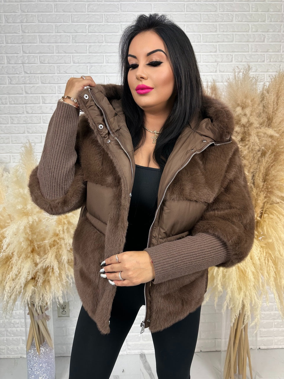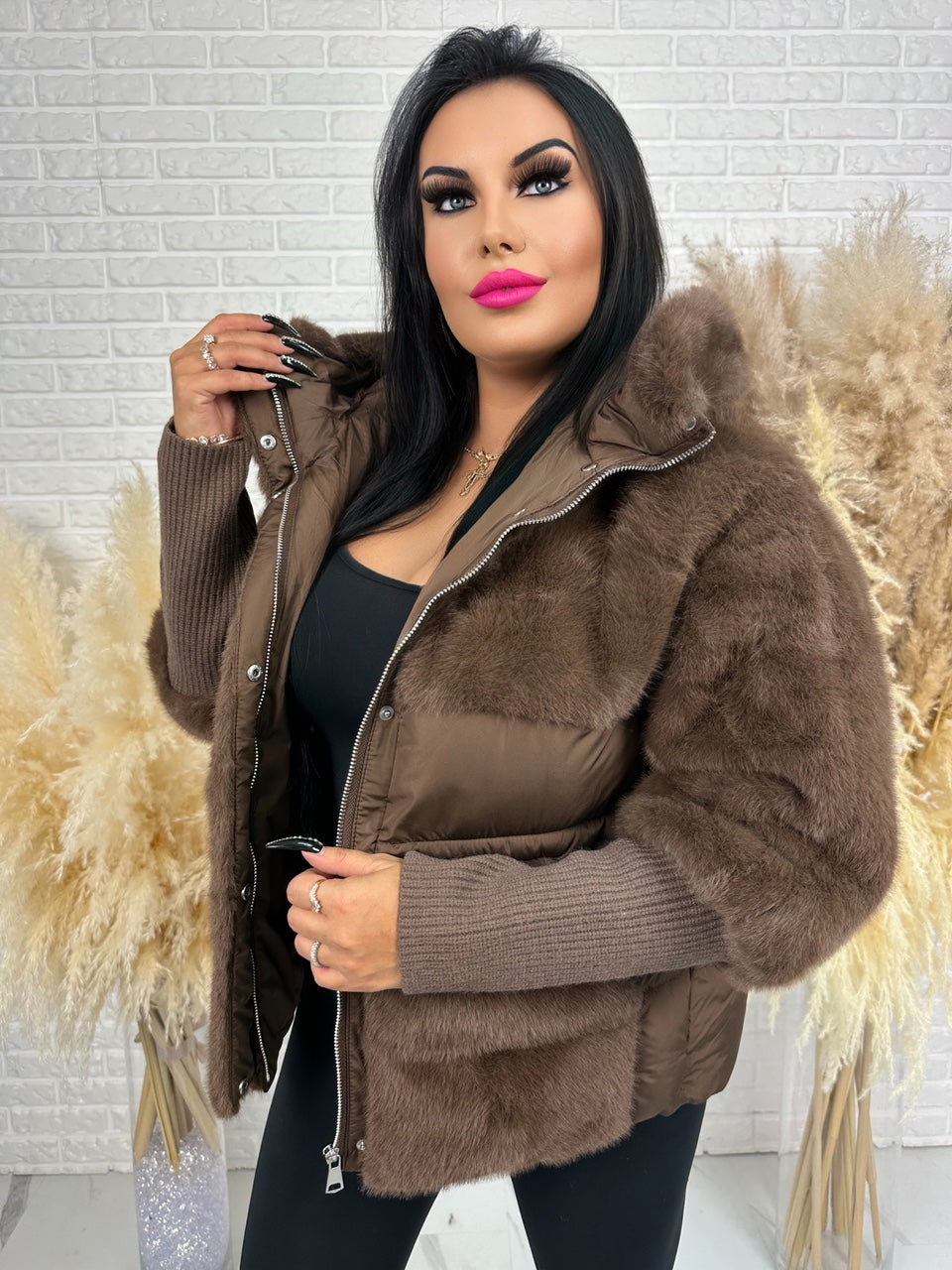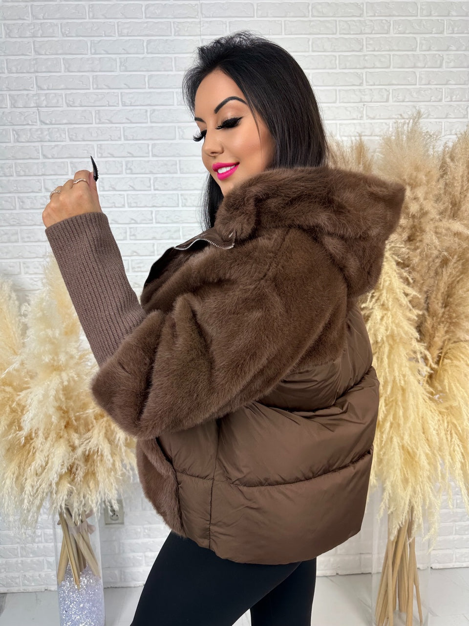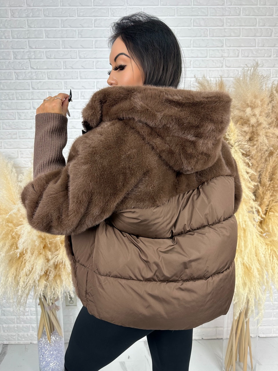 Kurtka SAWONA oversize z futerkiem i kapturem – stylowa kurtka damska brązowa