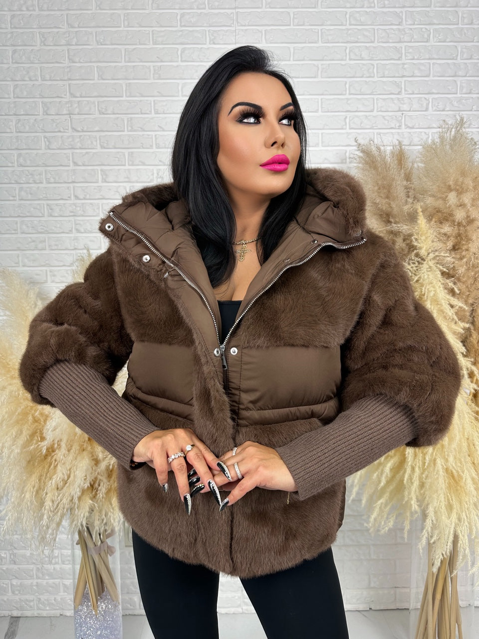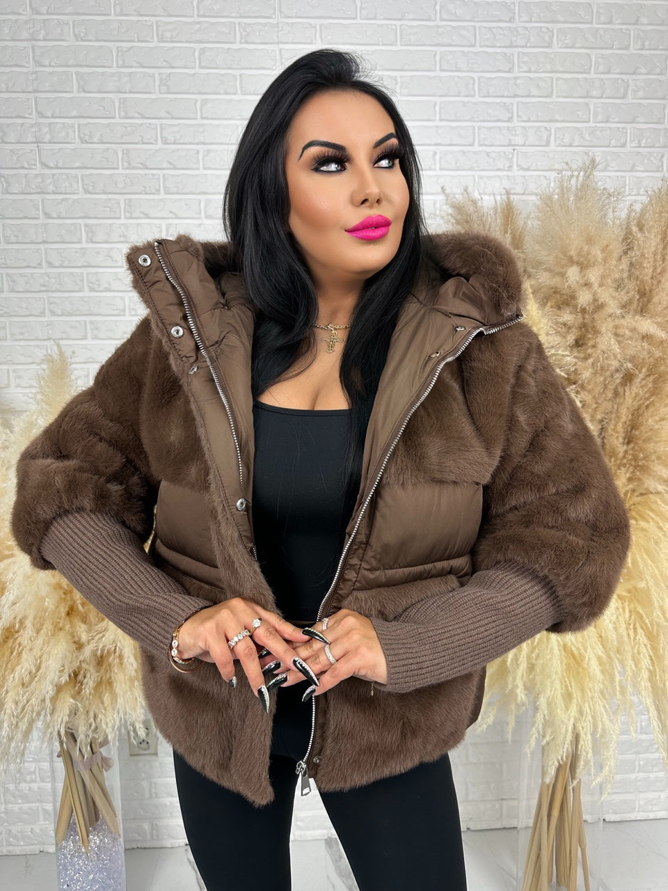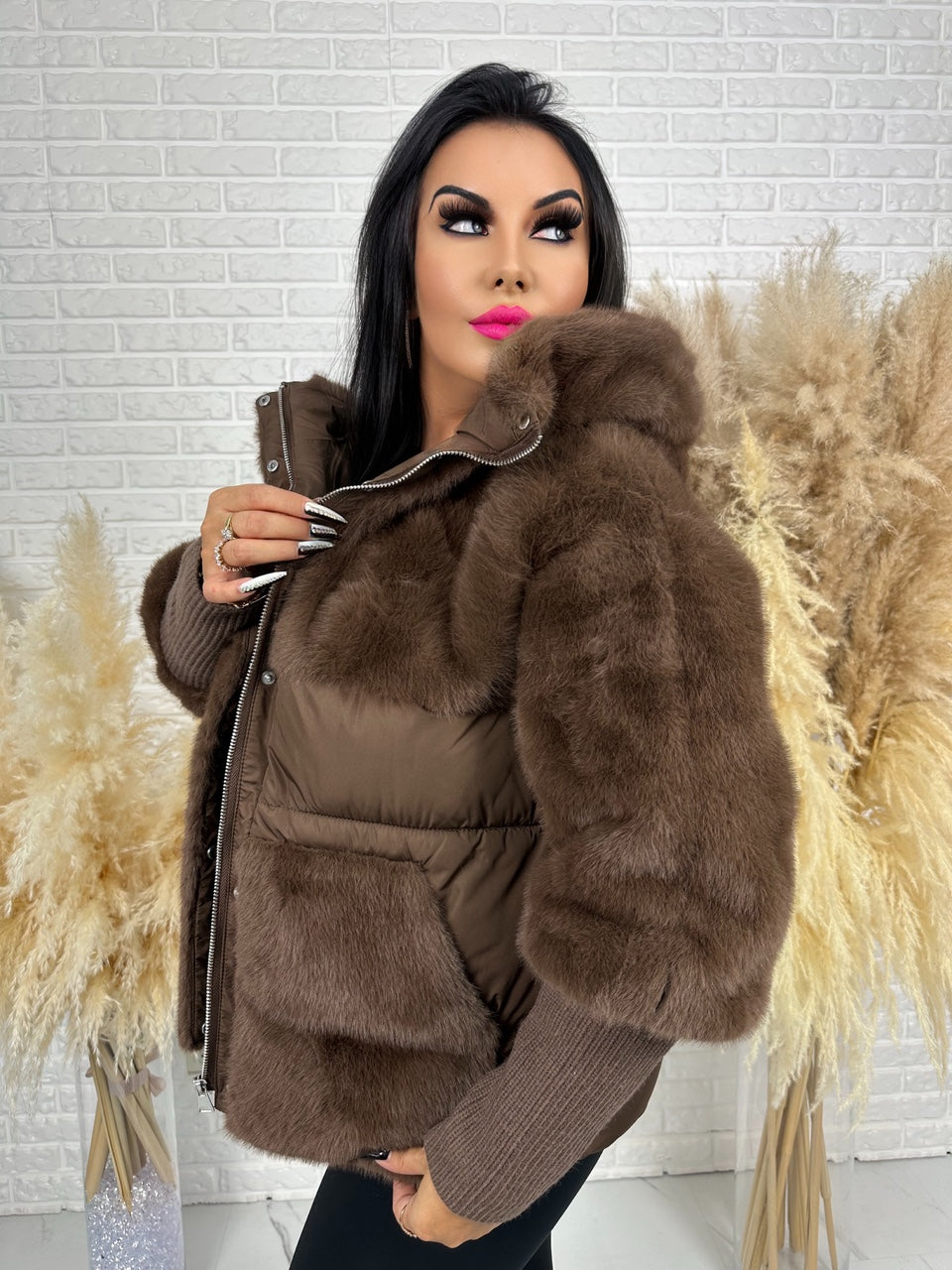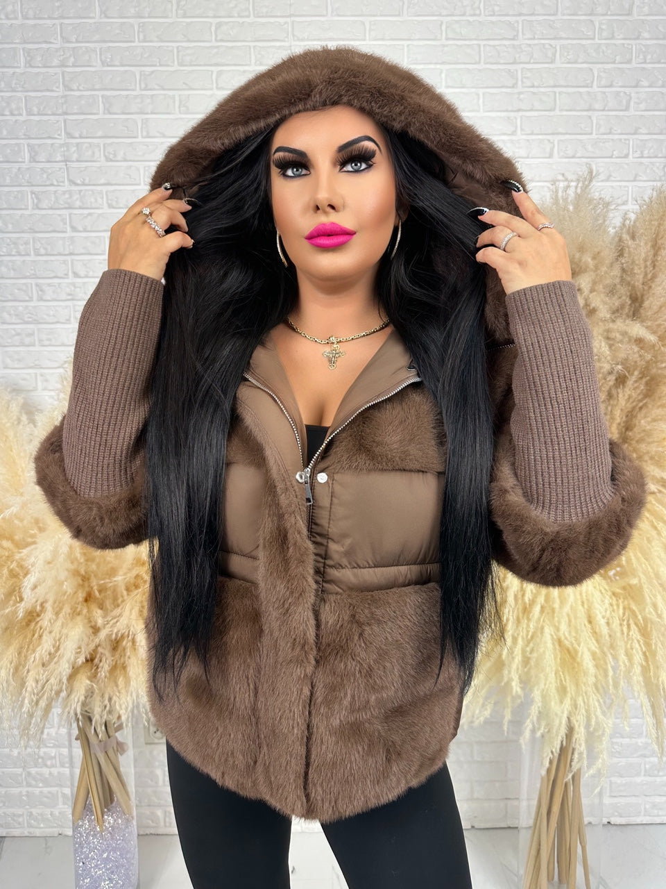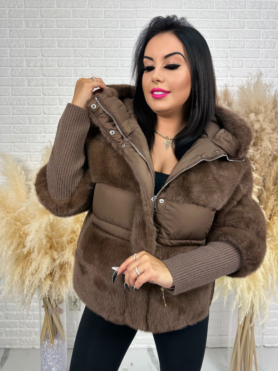 Kurtka SAWONA oversize z futerkiem i kapturem – stylowa kurtka damska brązowa