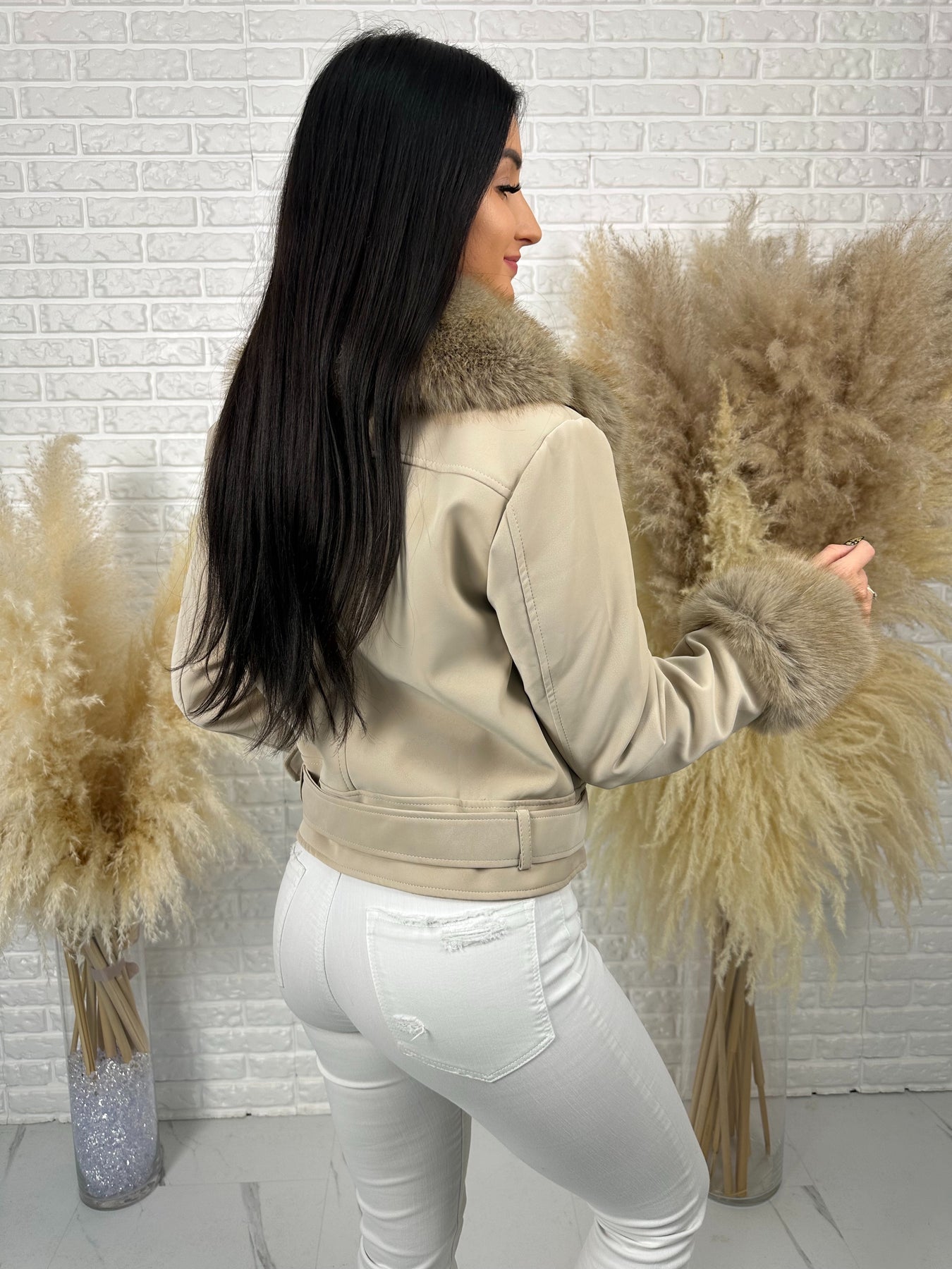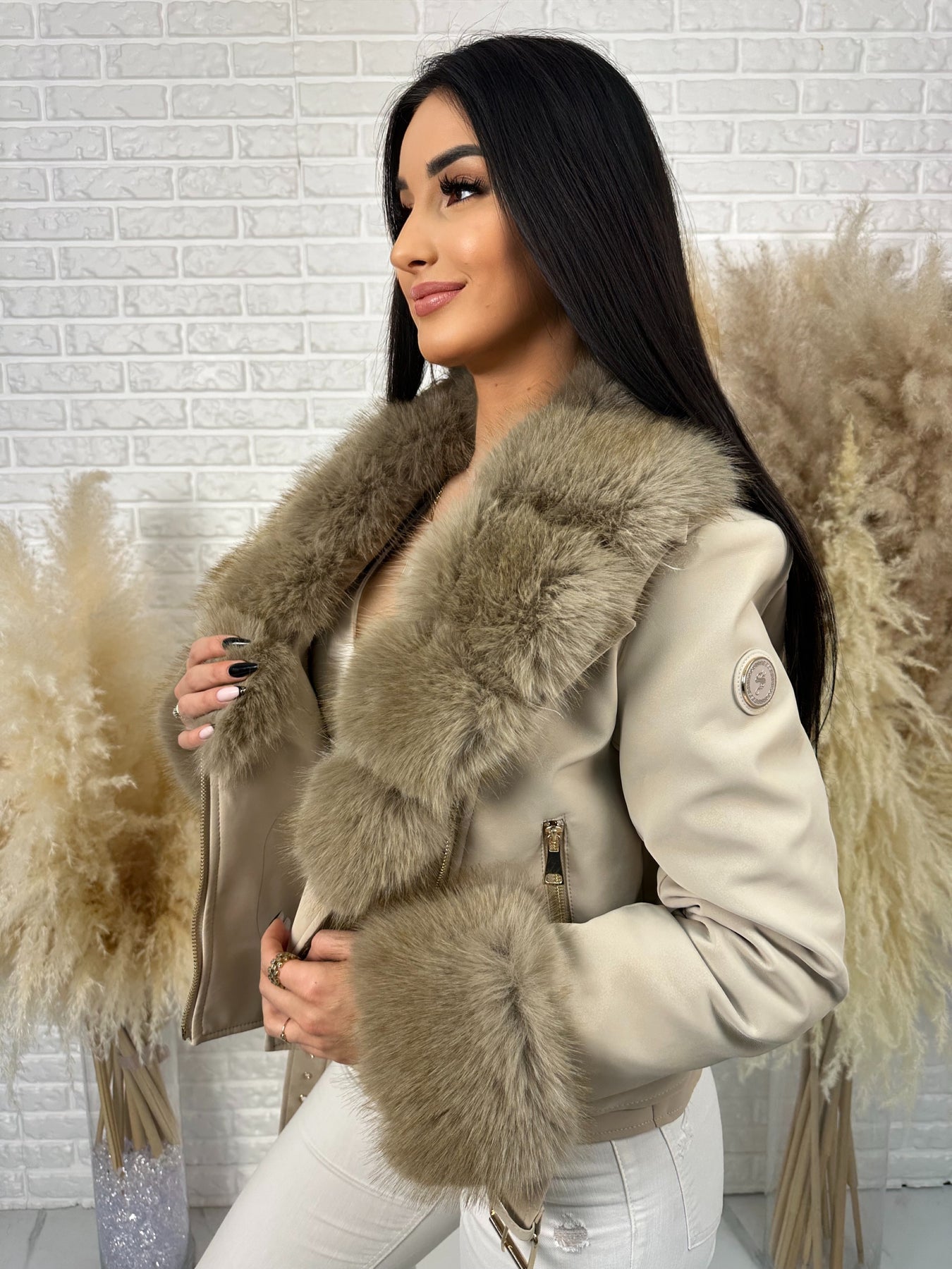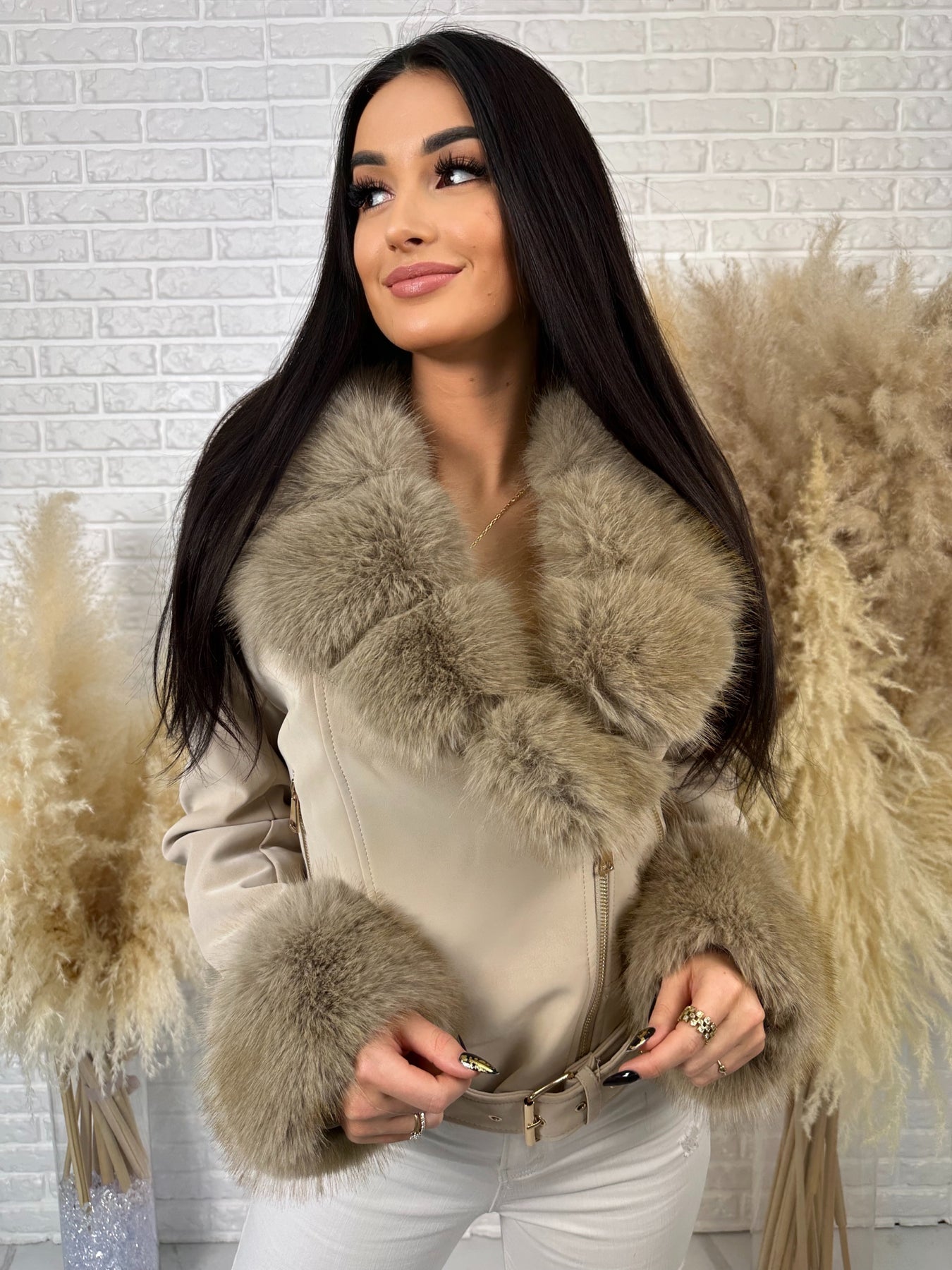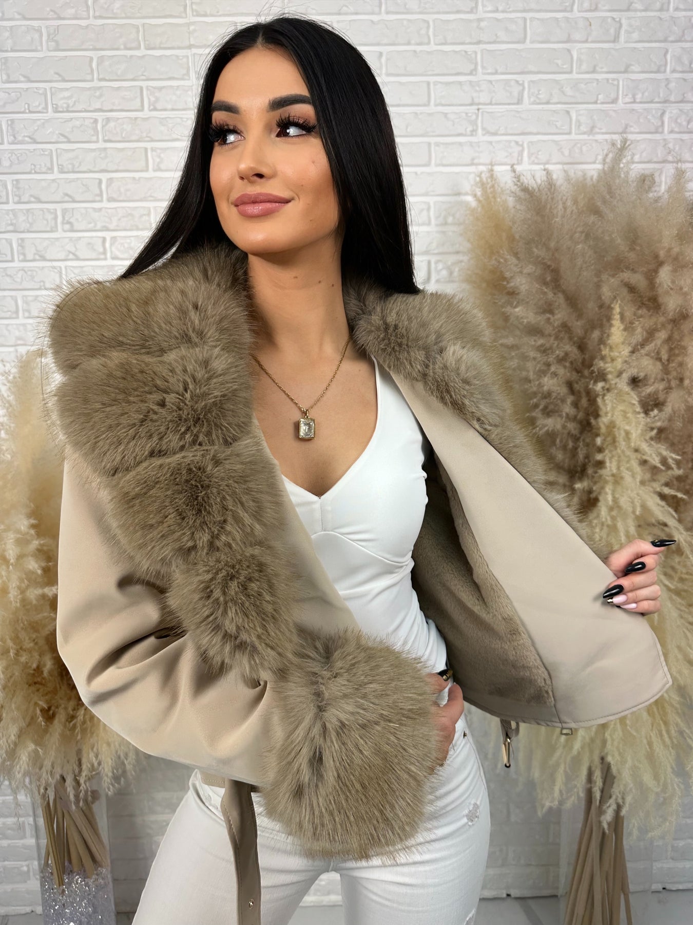 🤍 Efektowne, odpinane futerko przy kołnierzu i rękawach – luksusowy akcent, który robi całą stylizację