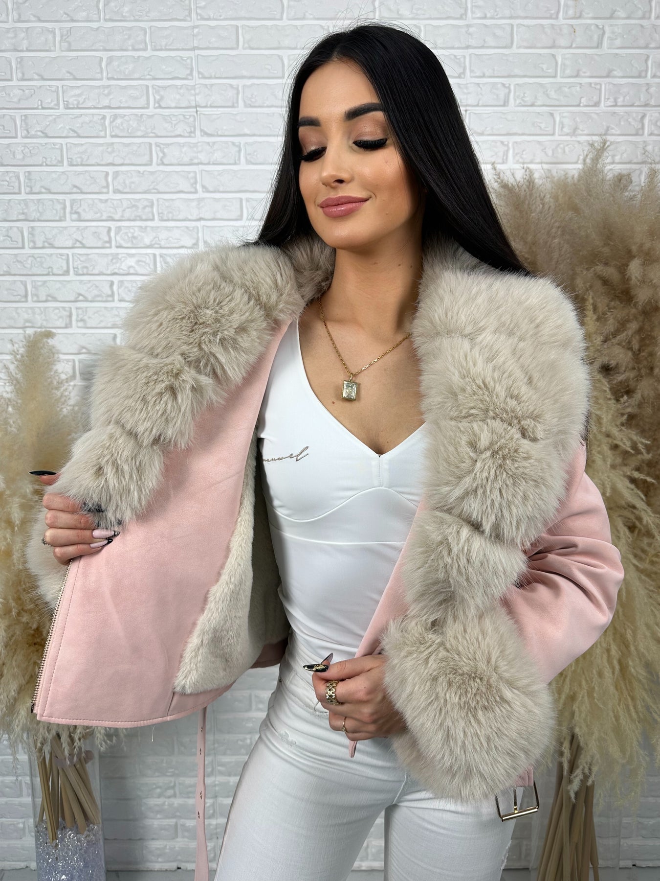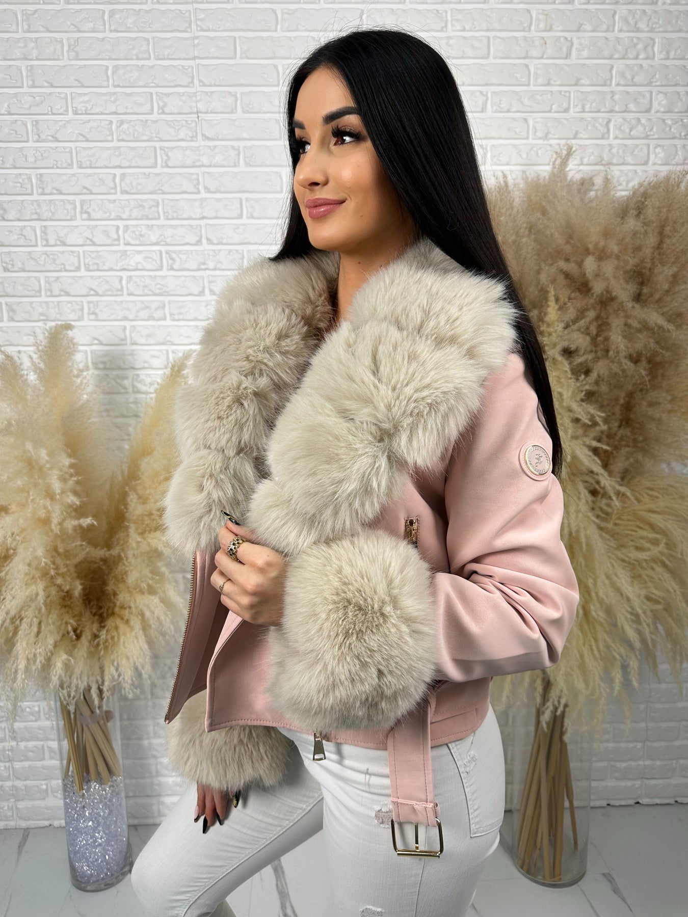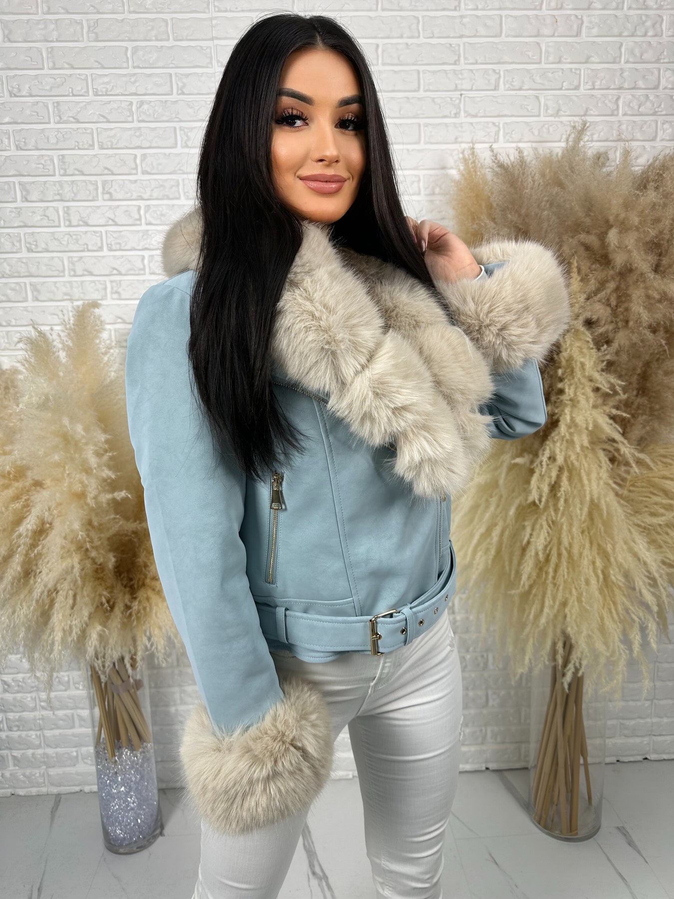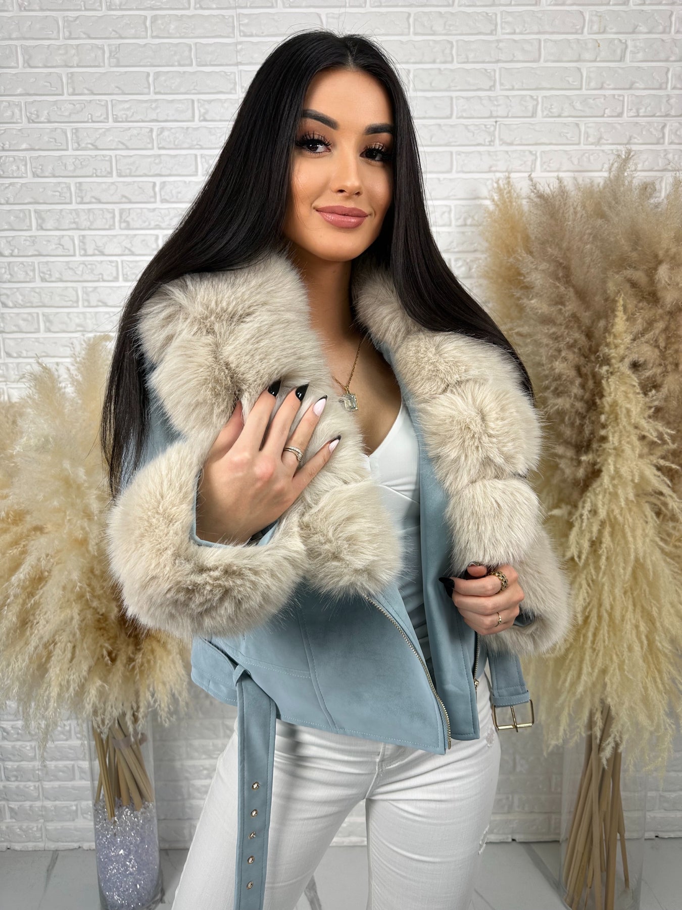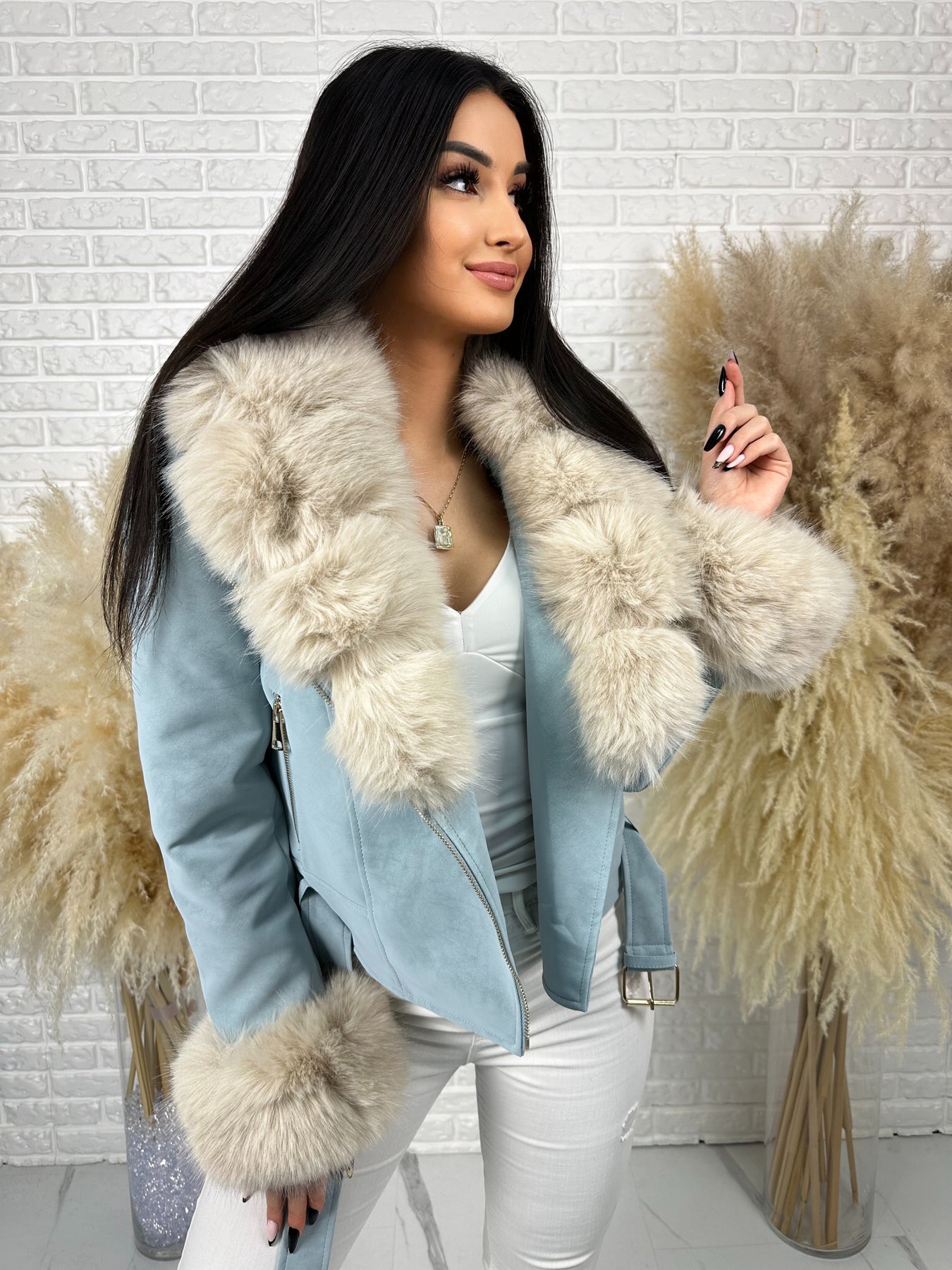 🤍 Efektowne, odpinane futerko przy kołnierzu i rękawach – luksusowy akcent, który robi całą stylizację