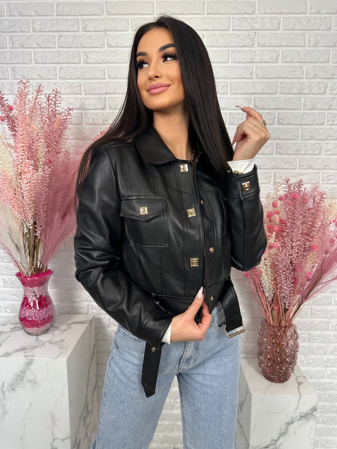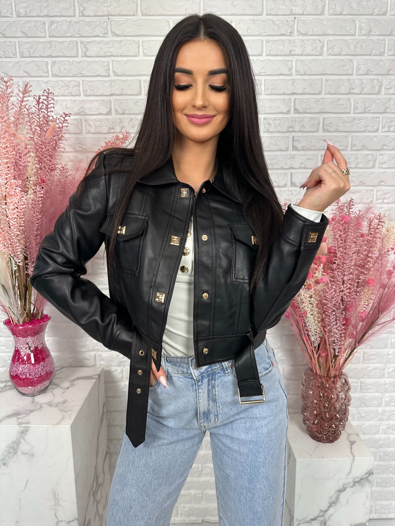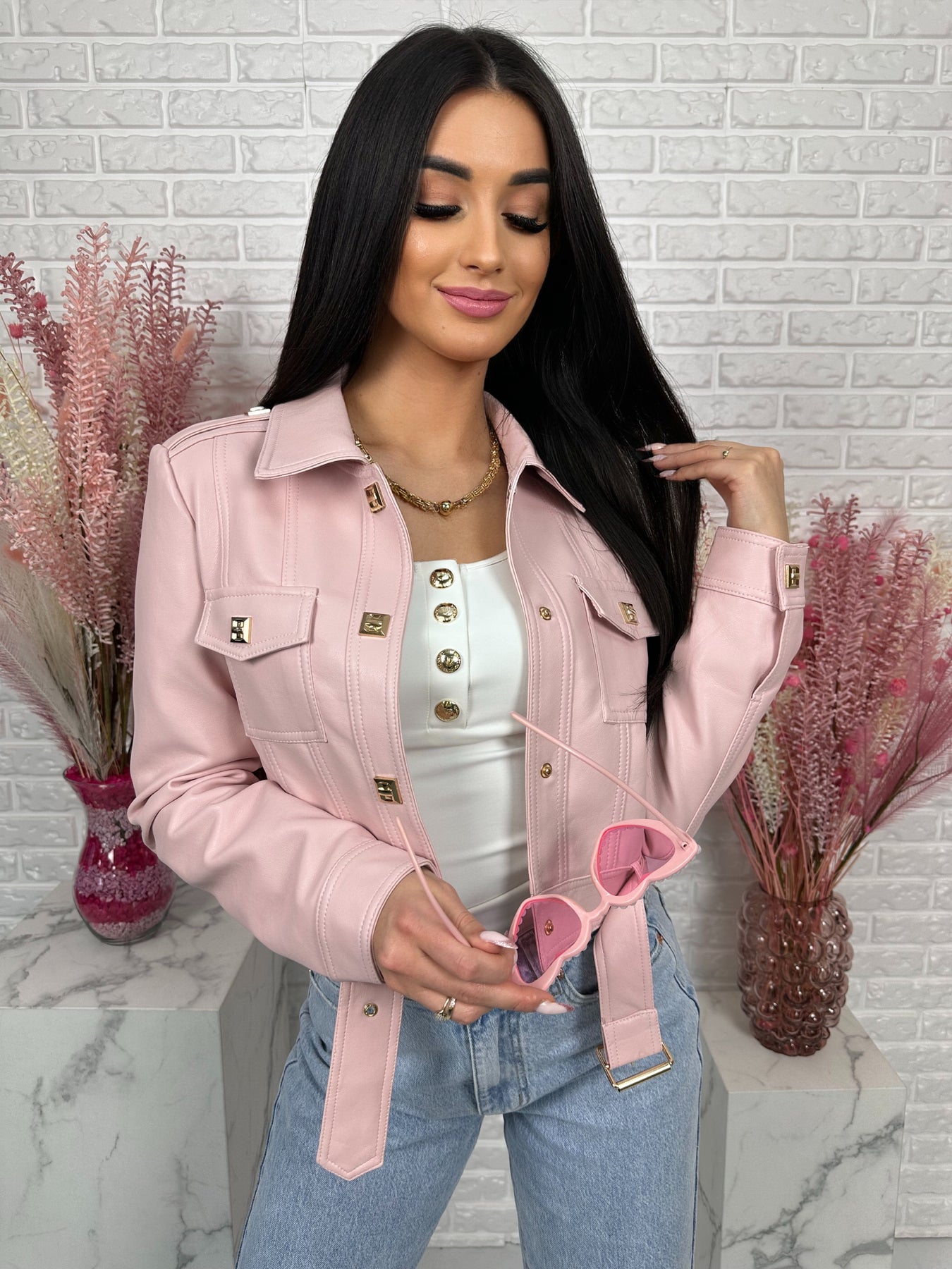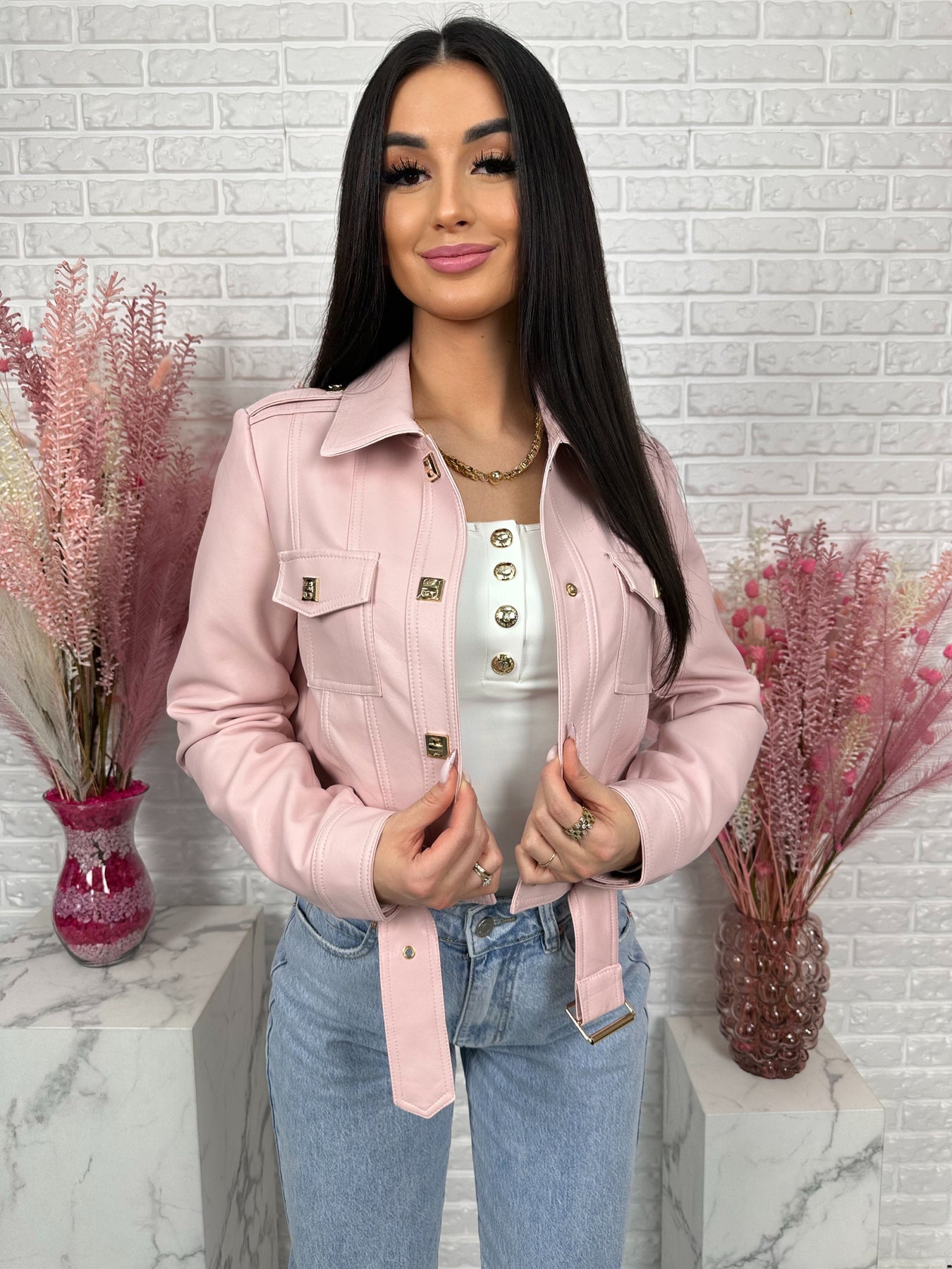 Model wyróżniają modne detale – ozdobne kieszenie na piersiach, pagony na ramionach oraz eleganckie złote napy. Dodatkowy pasek na dole pozwala jeszcze mocniej podkreślić talię i nadaje kurtce bardzo stylowego charakteru ✨