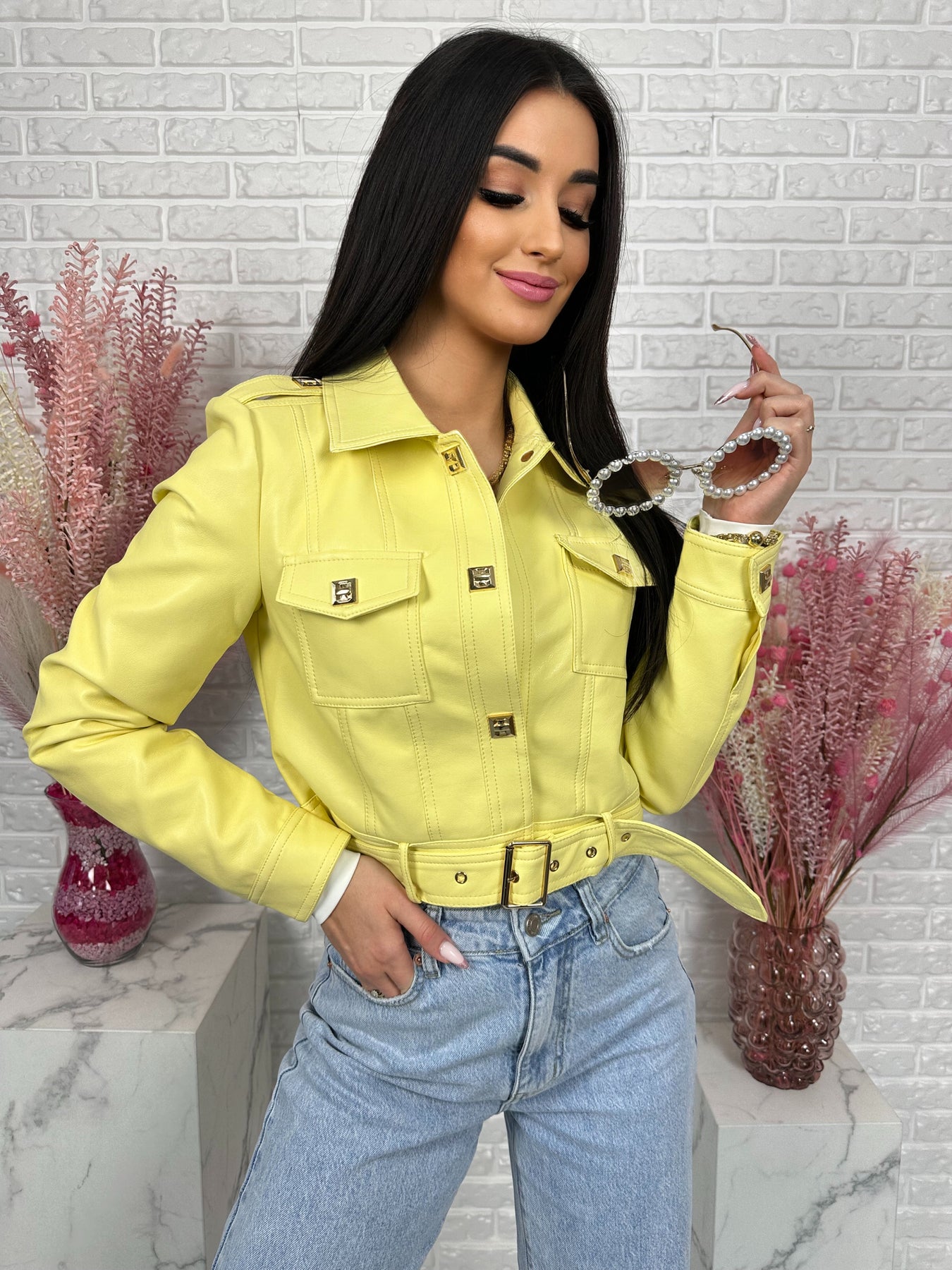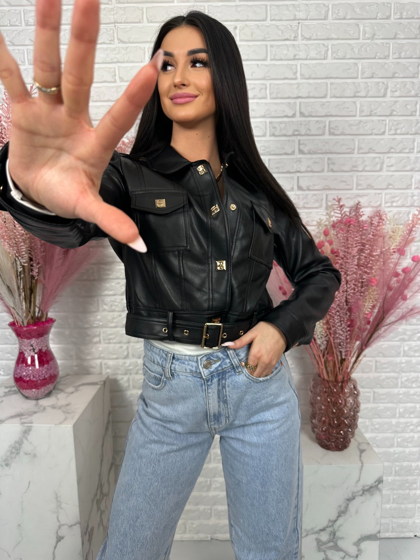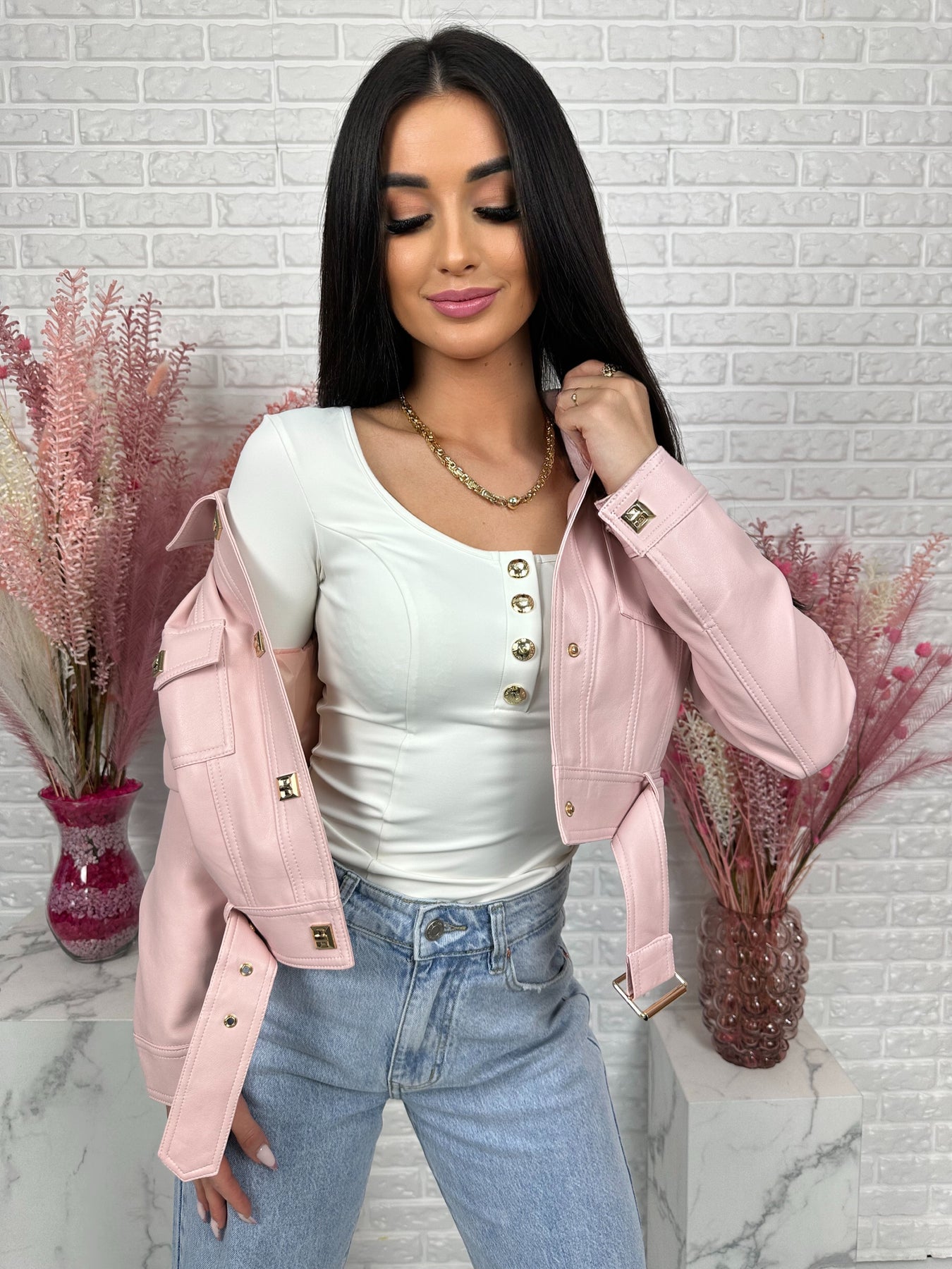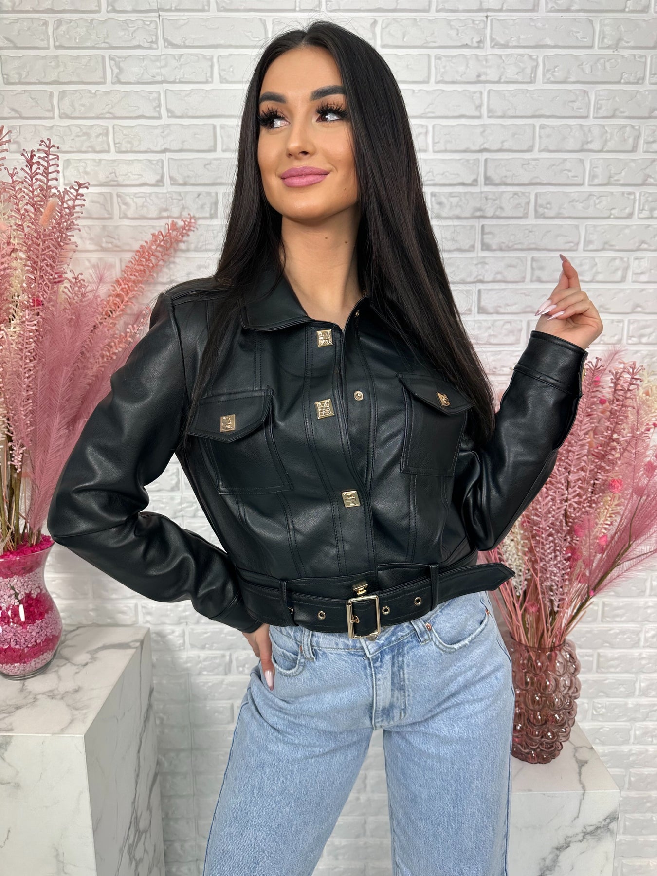 Model wyróżniają modne detale – ozdobne kieszenie na piersiach, pagony na ramionach oraz eleganckie złote napy. Dodatkowy pasek na dole pozwala jeszcze mocniej podkreślić talię i nadaje kurtce bardzo stylowego charakteru ✨